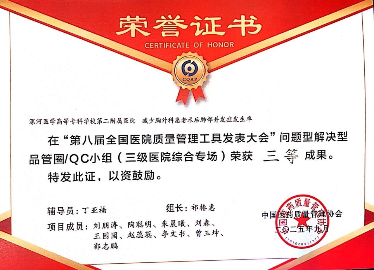 近日,第八屆醫(yī)院質(zhì)量管理工具應(yīng)用成果發(fā)表大會在重慶落幕。此次大賽共有來自全國的600多項(xiàng)課題參賽,其中413個(gè)項(xiàng)目入圍決賽,競爭激烈。 漯河醫(yī)專二附院(漯河市骨科醫(yī)院、漯河市立醫(yī)院)關(guān)節(jié)外科選送的RCA項(xiàng)目與胸外科選送的"非常好圈"品管圈項(xiàng)目,在各自專場中展現(xiàn)了扎實(shí)的專業(yè)素養(yǎng),最終在眾多優(yōu)秀團(tuán)隊(duì)中勝出,分別斬獲二等獎(jiǎng)和三等獎(jiǎng)。