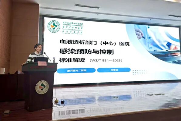 規(guī)范與賦能并重,夯實安全基石。 在質(zhì)量安全層面,漯河醫(yī)專二附院血液凈化室護士長呂春曉對《血液透析部門(中心)醫(yī)院感染預防與控制標準》進行了權(quán)威解讀,從建筑布局、人員管理、操作流程、監(jiān)測要求等多個方面,深入講解了標準的核心要點,為各醫(yī)療機構(gòu)落實規(guī)范化管理、確?;颊甙踩峁┝艘罁?jù)。由漯河市婦幼保健院血液凈化室護士長劉曉靜與臨潁縣人民醫(yī)院血液凈化室護士長陳曉夢主持會議。