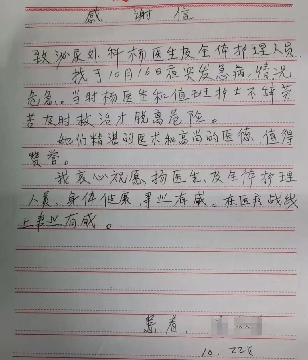 為感謝楊艷霞醫(yī)生的及時(shí)救治和護(hù)士們的貼心照顧,出院后患者特意寫(xiě)下一封感謝信,字里行間滿(mǎn)是對(duì)楊醫(yī)生專(zhuān)業(yè)醫(yī)術(shù)、敬業(yè)精神和人文關(guān)懷的由衷贊譽(yù),也表達(dá)了對(duì)醫(yī)院泌尿外科醫(yī)療服務(wù)的高度認(rèn)可。