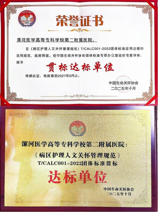 在備受矚目的授牌儀式環(huán)節(jié),大會正式公布了《病區(qū)護理人文關(guān)懷管理規(guī)范》團體標準第二批貫標驗收評審結(jié)果,并現(xiàn)場為達標單位授牌、頒發(fā)證書。漯河醫(yī)專二附院(漯河市骨科醫(yī)院、漯河市立醫(yī)院)憑借在人文護理領(lǐng)域扎實的工作成效和卓越的服務(wù)水平,成功通過評審,被正式授予“《病區(qū)護理人文關(guān)懷管理規(guī)范》團體標準貫標達標單位”。這一沉甸甸的牌匾與證書,不僅是一份崇高的榮譽,更是對漯河醫(yī)專二附院長期踐行“以患者為中心”服務(wù)理念、深耕人文護理建設(shè)的高度肯定與權(quán)威認可。