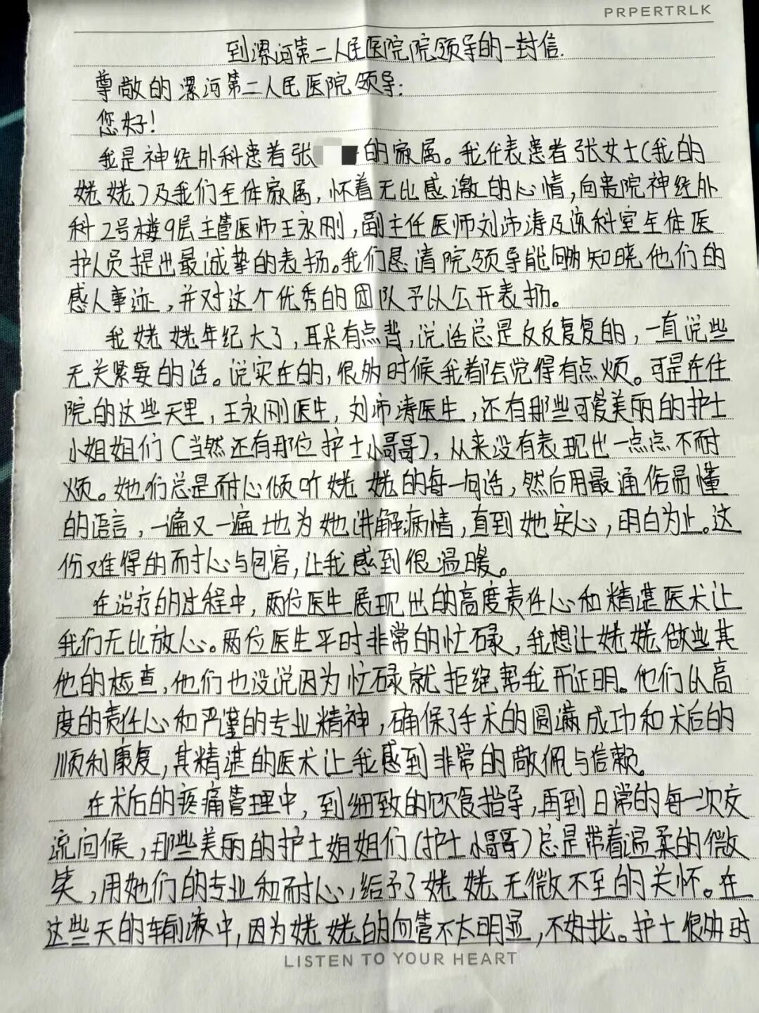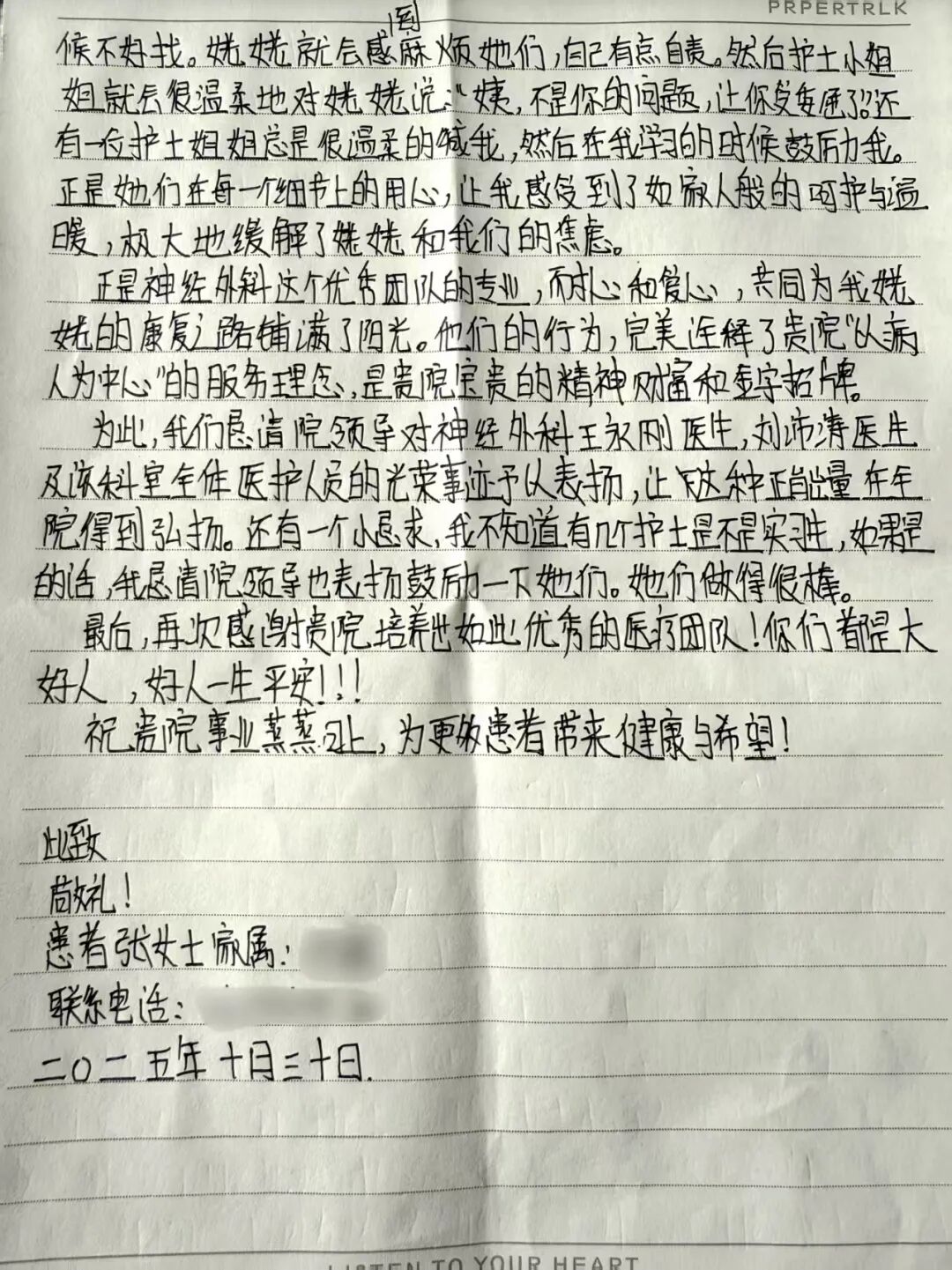 據(jù)了解,張女士的姥姥因“背部腫物”一直備受困擾,6年前在其他醫(yī)院手術(shù)治療后效果不佳,1年內(nèi)復(fù)發(fā),腫物逐漸增大,并出現(xiàn)肩部活動受限伴肩部疼痛。來到市二院后神經(jīng)外科醫(yī)生立即進行手術(shù),因術(shù)中腫物與周圍組織粘連嚴(yán)重,手術(shù)歷時近2個小時,術(shù)后恢復(fù)良好。“我的姥姥年紀(jì)大了,耳朵有點背,說話總是反反復(fù)復(fù),啰啰嗦嗦的。說實在的,有時候我都會覺得有點煩。可是從住院以來,劉沛濤主任、王永剛醫(yī)生,還有那些美麗可愛的護士小姐姐們和帥氣的護士小哥哥,從來沒有表現(xiàn)出一點點不耐煩。他們總是耐心地聽姥姥講,一遍遍地解釋給她聽,直到她聽懂為止。”張女士的表揚信中字里行間包含著對神經(jīng)外科整個醫(yī)護團隊暖心服務(wù)的認(rèn)可與贊美。